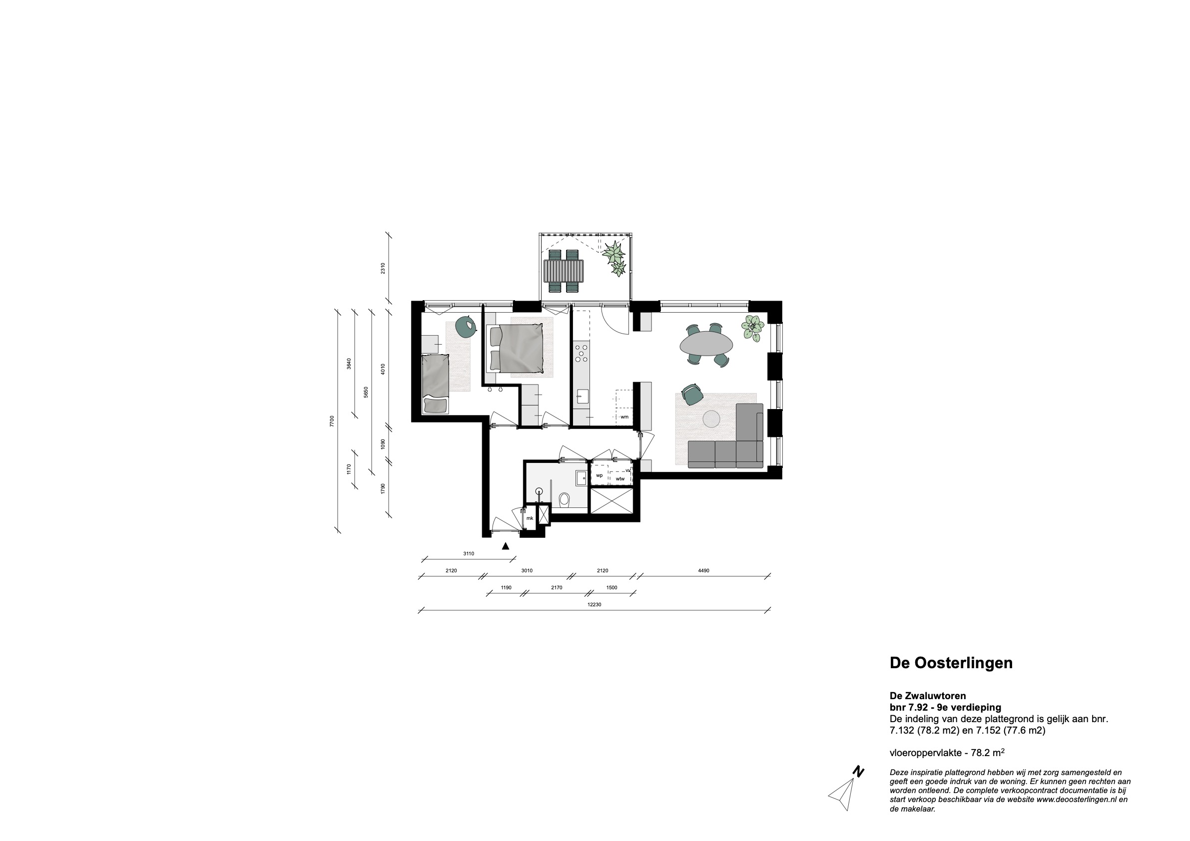 Dit driekamerhoekappartement heeft een ruime en lichte woonkamer. Hier creëer je een gemakkelijk een fijne zit- en eethoek. De halfopen keuken geeft toegang tot de loggia. Deze is met harmonicaramen dicht te maken, zodat je hier het hele jaar door heerlijk zit.